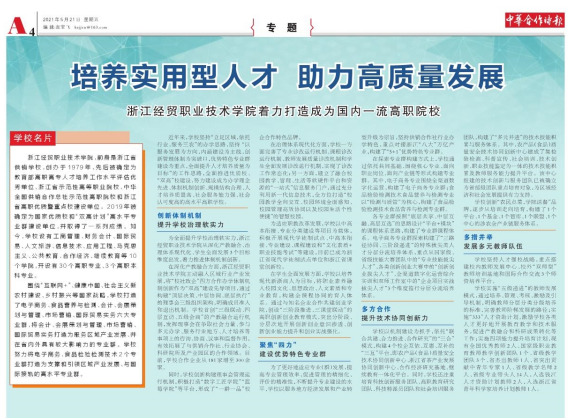 在学生全面发展方面,学校以培养现代新浙商人为目标,将职业素养融入校园文化、思想政治、人文素质和专业教育,构建全课程协同的育人体系。通过与知名企业合作共建创业学院,创设“三阶段推进、三课堂联动”的高职创新创业教育模式,突出分阶段、分层次地开展创新创业意识渗透、创新创业能力提升和创业实战强化。